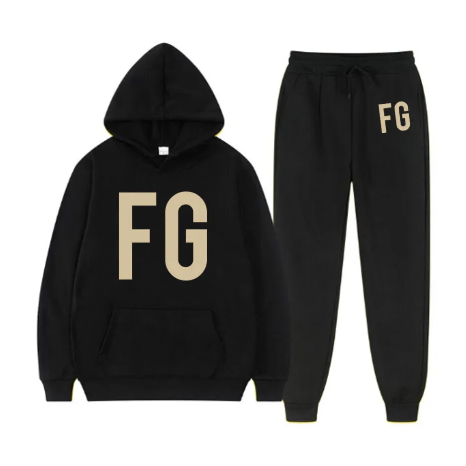The Essentials FG Logo Tracksuit – Black from Essential Clothes is a fusion of contemporary streetwear and comfort everyday. Made of soft, breathable materials, it has a silky-smooth, stretchy feel that makes it ideal for relaxing at home, running errands . Ribbed cuffs and relaxed fit add style and comfort to Essentials Tracksuit which also buttons up with the iconic FG logo on the chest for a strong branding statement in minimalist fashion. The coordinating joggers feature an elastic waistband with drawstring for a comfortable, adjustable fit. Its classic black hue allows it to be paired with sportscar or with everyday layers.The Essentials Tracksuit is the perfect combination of comfortable, stylish and versatile to wear day to day. A classic piece from any wardrobe, it helps keep your look fresh, contemporary and polished.